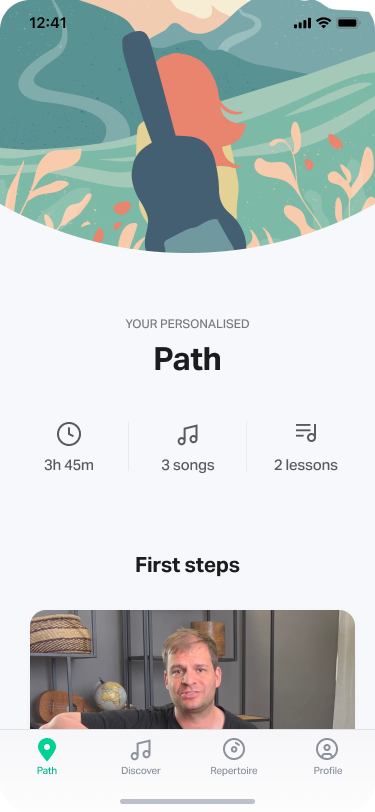 Campfire automatically creates a unique learning path for every user, based on the songs they choose. The app arranges the selected songs in the order that’s the most optimal for learning. It gives recommendations for exercises to build guitar skills and enables the user to see all of the goals ahead.