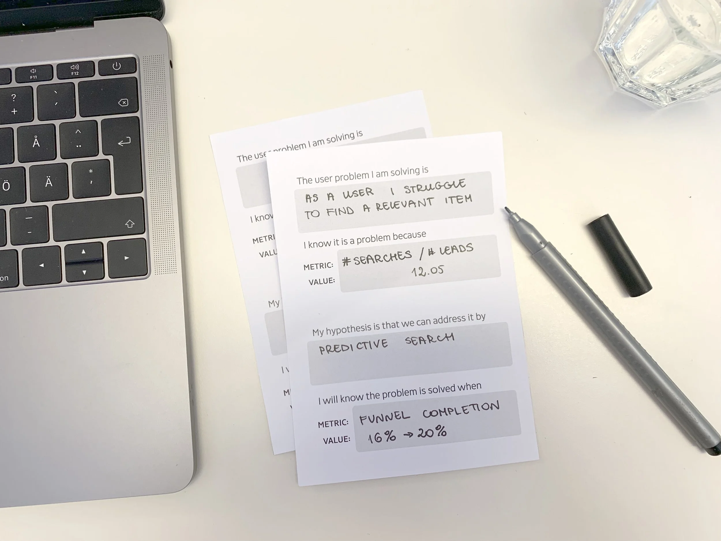 In order to highlight the importance of thinking in terms of verifiable hypotheses, we have started using cards that encourage the designers to verbalize the actual user problem they are solving and set up metrics to prove the chosen solution addresses it well.