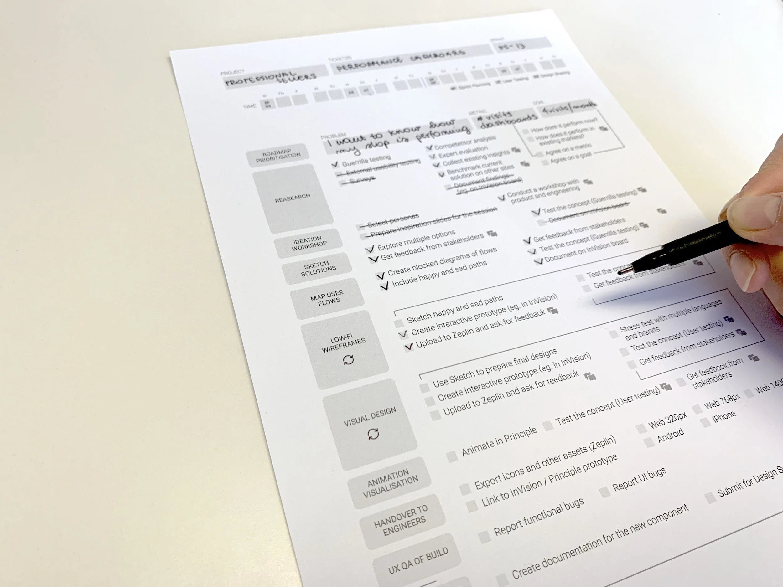 The company UX Process is composed of several phases consisting of multiple activities. I have prepared a UX cheat sheet that can be printed and used for each new assignment.