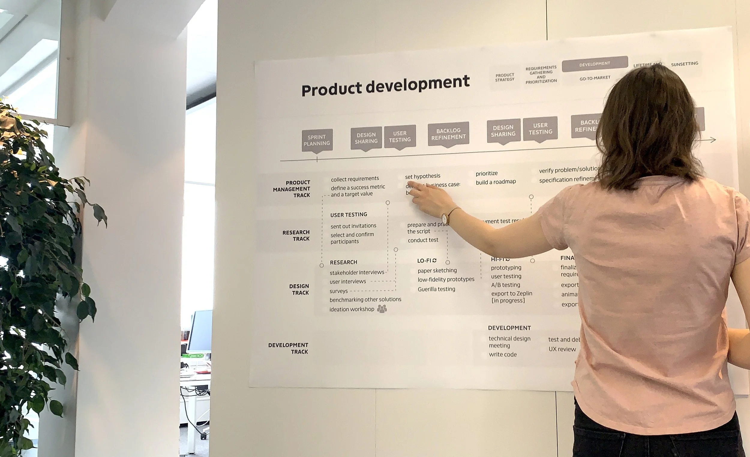 After the processes have been discussed and formulated during an extensive and cross-functional workshop, I have produced a big-size poster that is displayed at the daily-standup meeting area. It serves as a tool to showcase the stages of the process and indicate at what point the collaboration is crucial.
